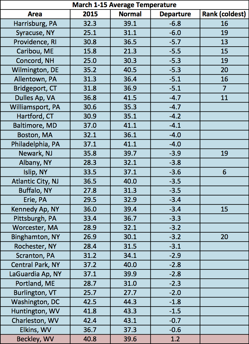 The entire region was colder than normal during the first two weeks of March.