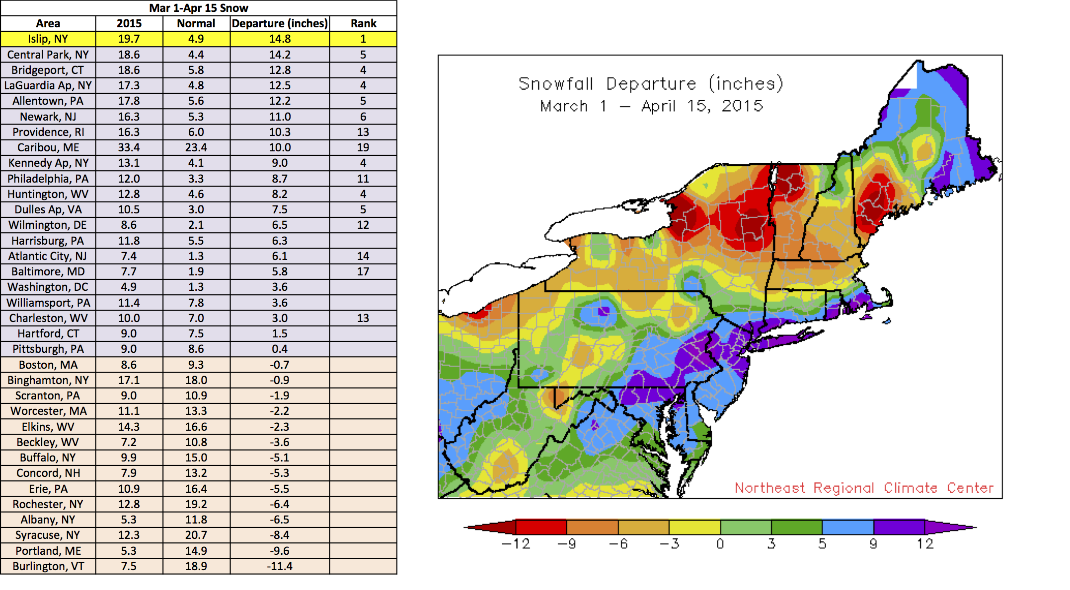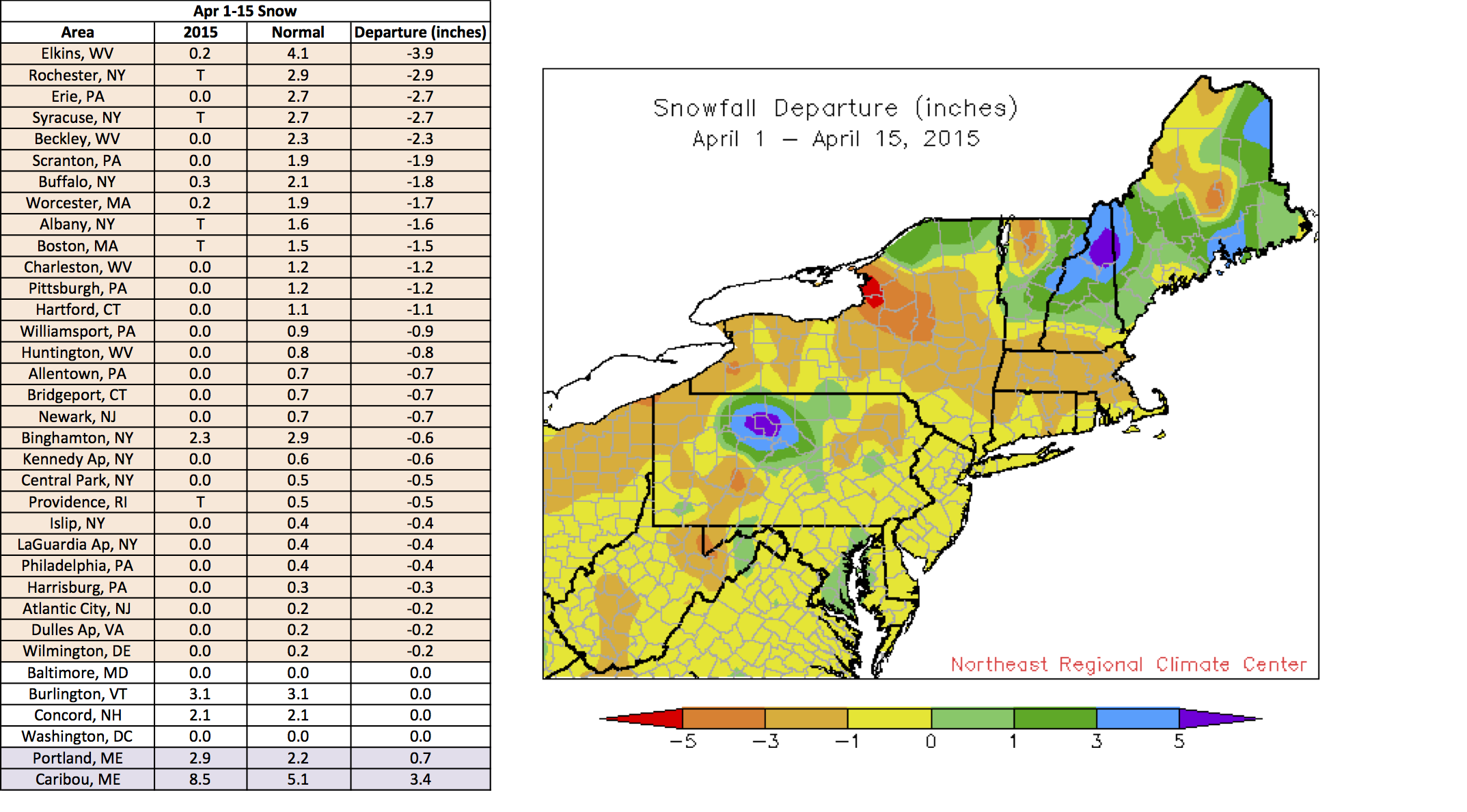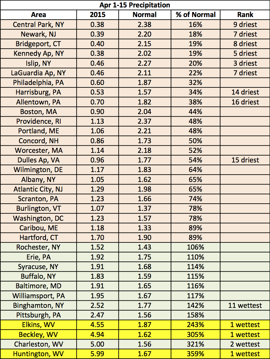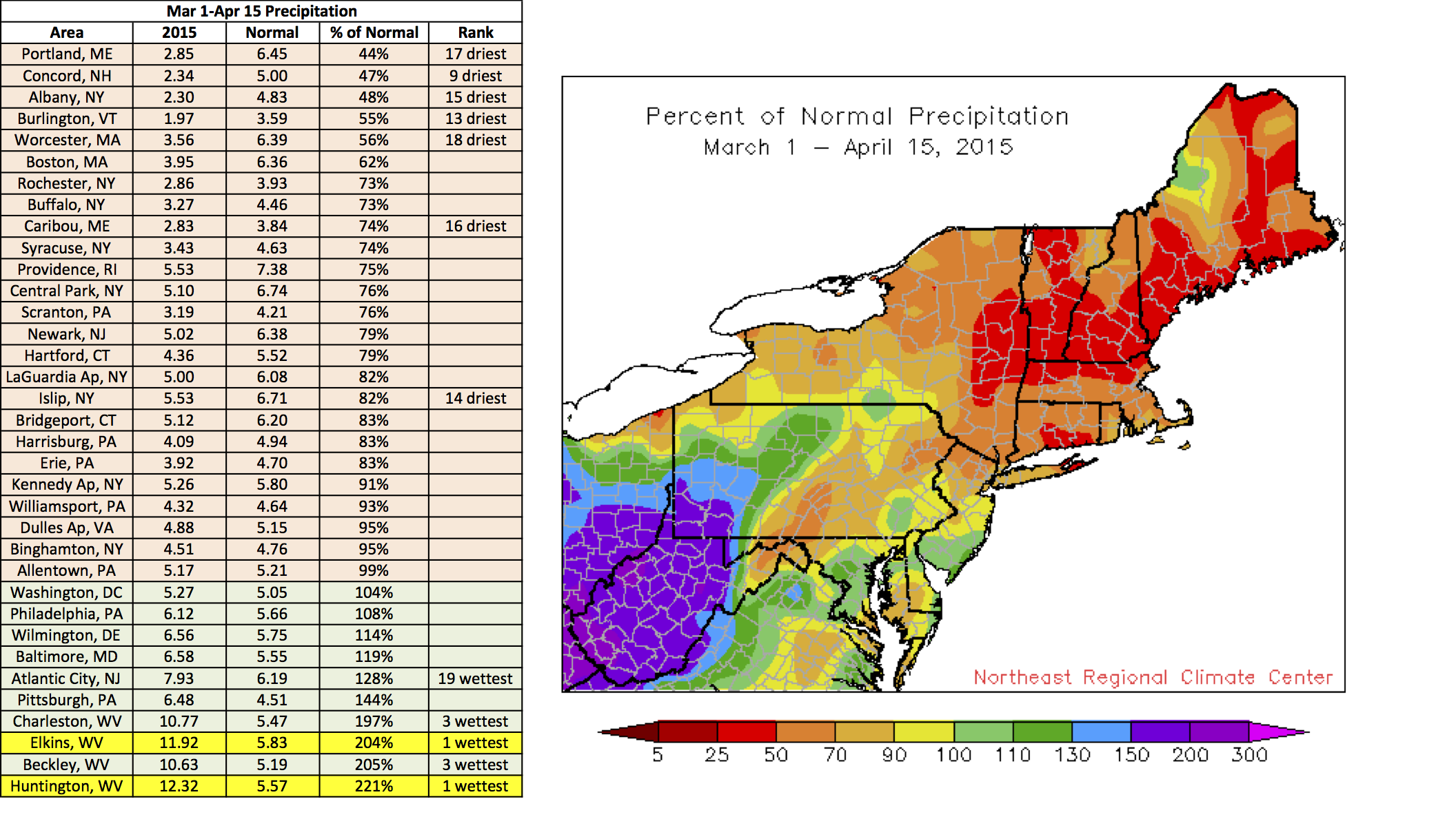 During the first two weeks of April, areas closer to the coast have seen less than 50 percent of normal precipitation, while much of West Virginia has seen more than 200 percent of normal. In fact, three West Virginia sites had record wet starts to the month. The precipitation pattern for the first half of spring has been similar to April, with areas that were very dry or very wet. Snowfall during the first half of April was near to below normal for most of the region; however, spring snowfall ranged from a foot below normal to a foot above normal.
