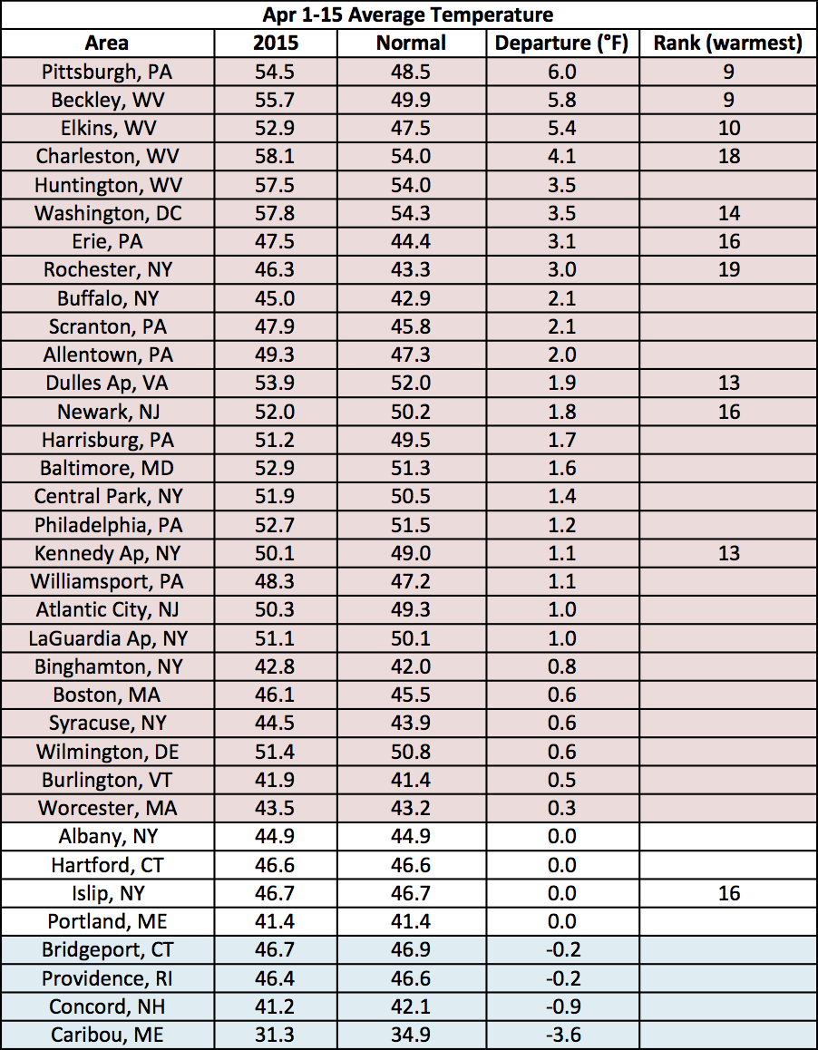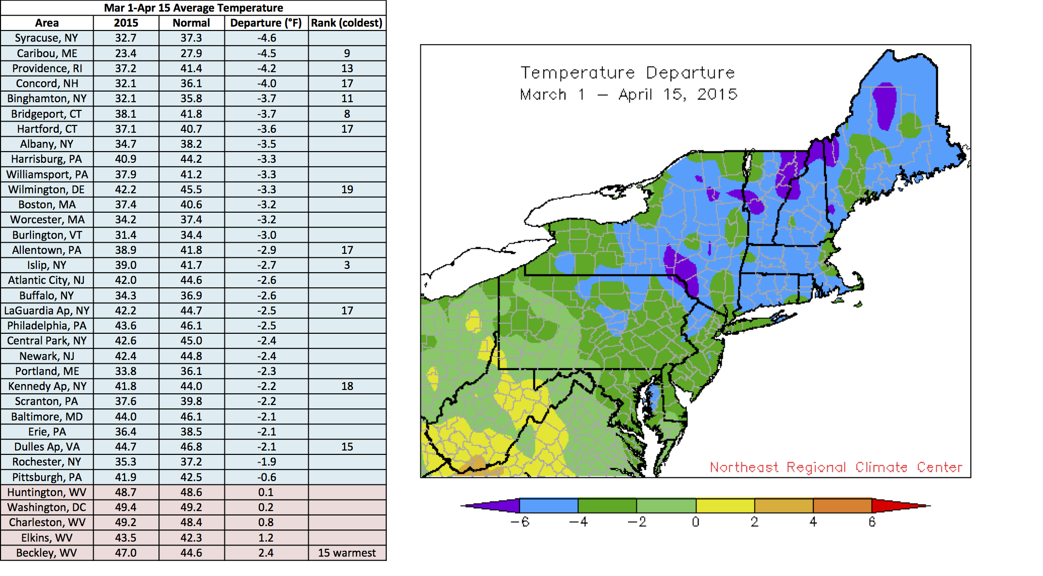 At the halfway point, April temperatures ranged from more than 4 degrees F below normal in northern New England to more than 4 degrees F above normal in West Virginia and western Pennsylvania. However, looking back to the start of March, spring temperatures were generally running below normal.