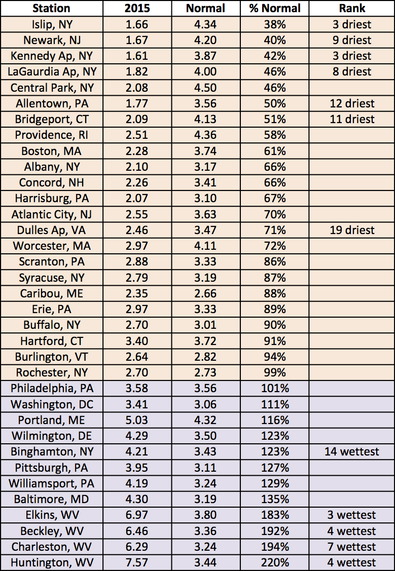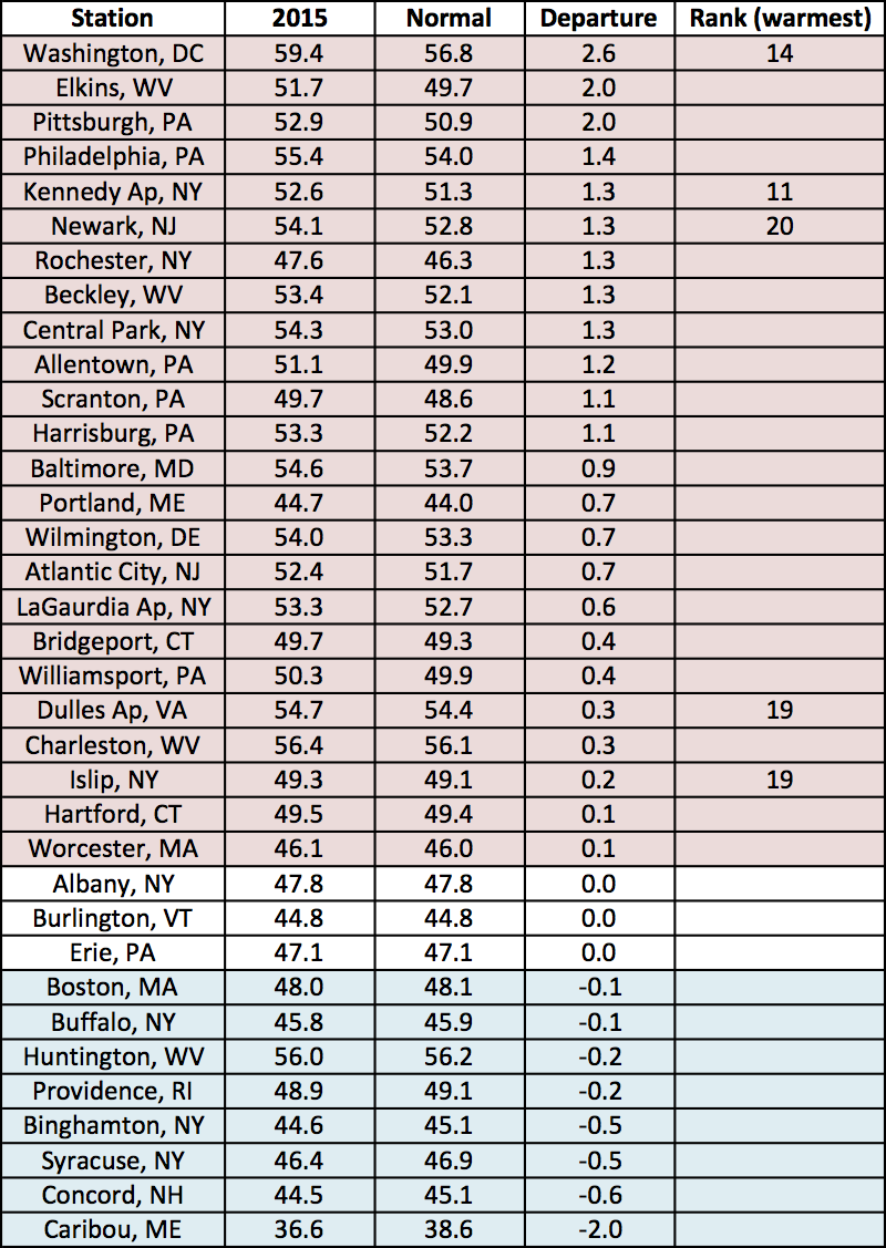The two corners of the region were at odds in terms of temperature, as well. While West Virginia was warmer than normal, New England was colder than normal. The rest of the Northeast generally saw temperatures within 2 degrees of normal. There was one thing most of the region did have in common, though: a lack of snow.