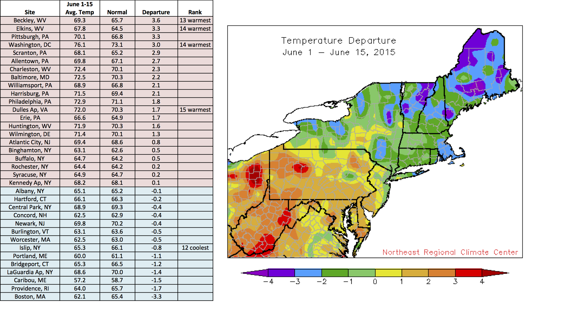 Temperatures during June so far have generally ranged from 4 degrees F below normal to 4 degrees F above normal, with the coolest areas in New York and New England and the warmest areas in West Virginia, Pennsylvania, and the Mid-Atlantic. Of the 35 airport climate sites, 21 sites saw above-normal temperatures during the first two weeks of June.