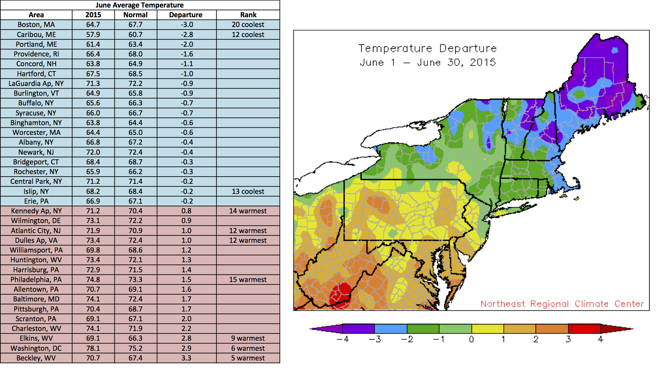 Average temperatures for June generally ranged from 4 degrees F below normal to 4 degrees F above normal. The 35 airport climate sites were nearly split, with 19 sites wrapping up the month on the cool side of normal and 16 sites on the warm side.