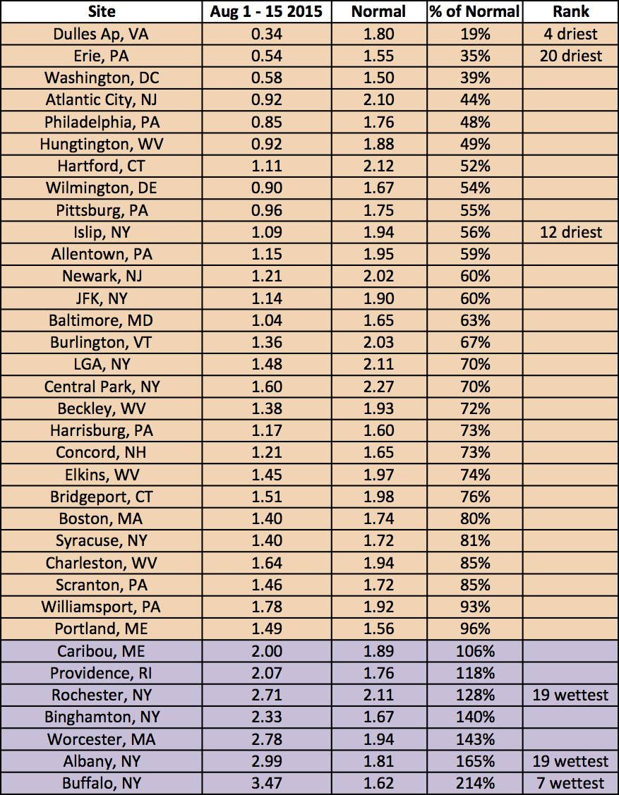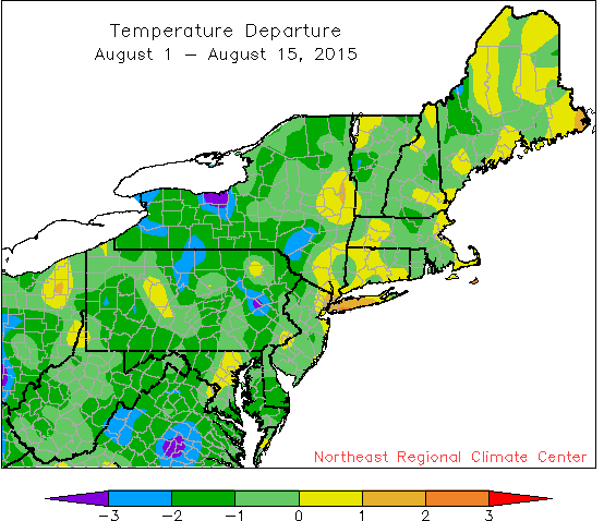 Rainfall has been noticeably lacking across much of the Northeast during the first two weeks of August. Departures have ranged from less than 25 percent of normal to 90 percent of normal for most areas. The recent lack of rain prompted an expansion of abnormally dry conditions in New Jersey, New York, and Connecticut. As for temperatures, departures have generally been within 2 degrees of normal, with most areas on the cooler side.