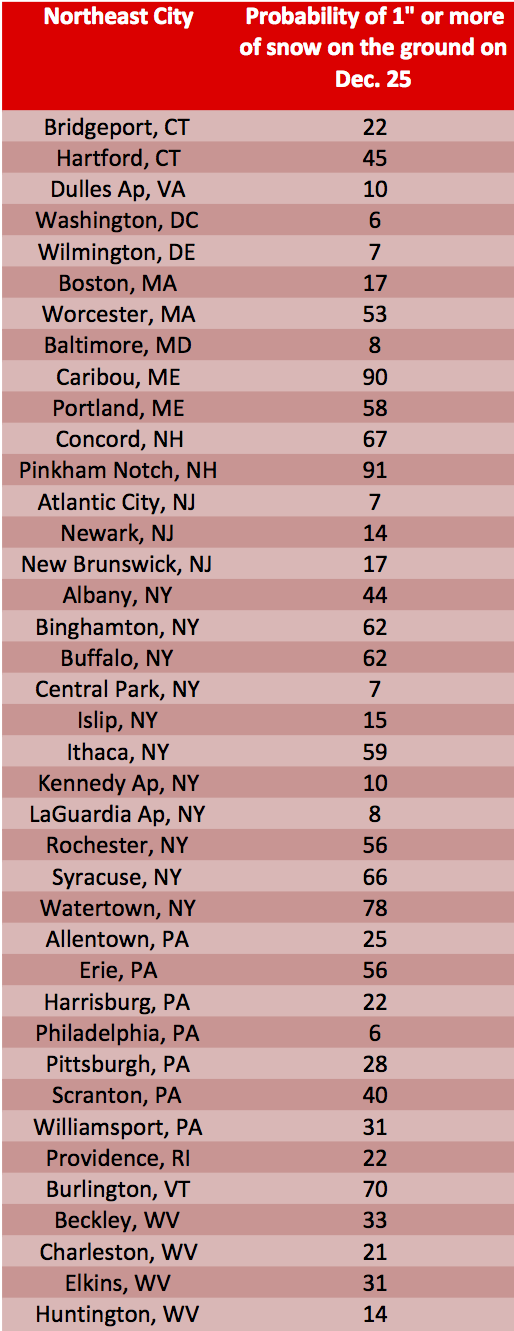 The holiday season is upon us, so we once again begin to wonder if we’ll have a white Christmas. These probabilities for select U.S. and Northeast cites are based on historical data from 1966-2015. All of the previous 50 Christmas’s have been white in Fairbanks, AK. If you prefer to stay in the Northeast, Caribou, ME and Pinkham Notch, NH have 90 and 91 percent probabilities respectively. You might be yearning for a white holiday after last year’s green and very warm December.