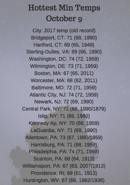 Low temperatures on October 8 and 9 were particularly warm (in the upper 60s to mid 70s). At least 51 hottest minimum temperature records were set or tied at the major climate sites on those dates. Ten sites had their hottest minimum temperature for October, while another 14 sites ranked their minimum temperatures among their top 5 hottest for October.