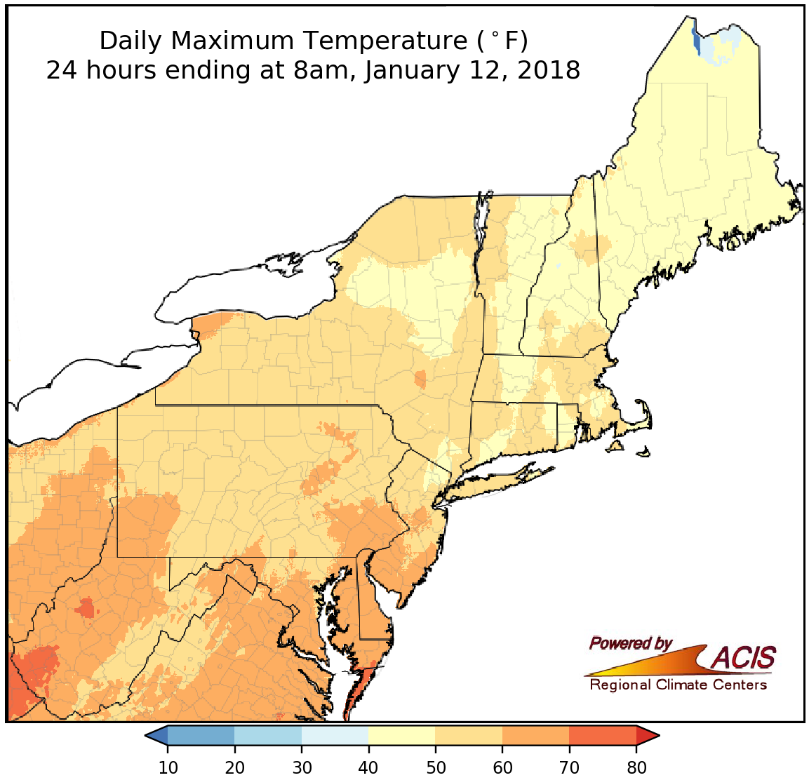 During the first half of January, average temperatures ranged from 3°F to 9°F below normal for a majority of the Northeast. All 35 major climate sites experienced below-normal temperatures, with 26 of them ranking this first half of January among their 20 coldest. There was a brief break from the cold from January 11-13 when highs soared into the 50s, 60s, and 70s and several sites set daily maximum temperature records.