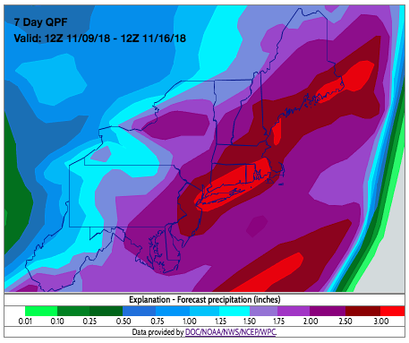 It’s been a wetter-than-normal year for a majority of the 35 major climate sites in the Northeast. As of the 8th, 18 sites have already had one of their 20 wettest years on record. From 1 to more than 3 inches of precipitation is forecast for the Northeast over the next seven days, so a few more sites may be added to that list. In fact, Baltimore, MD, and Charleston, WV, have the potential to have their wettest years on record if they receive a little under 3 inches of precipitation during the rest of November and December. Baltimore already had its wettest July on record, while Charleston had its wettest September.