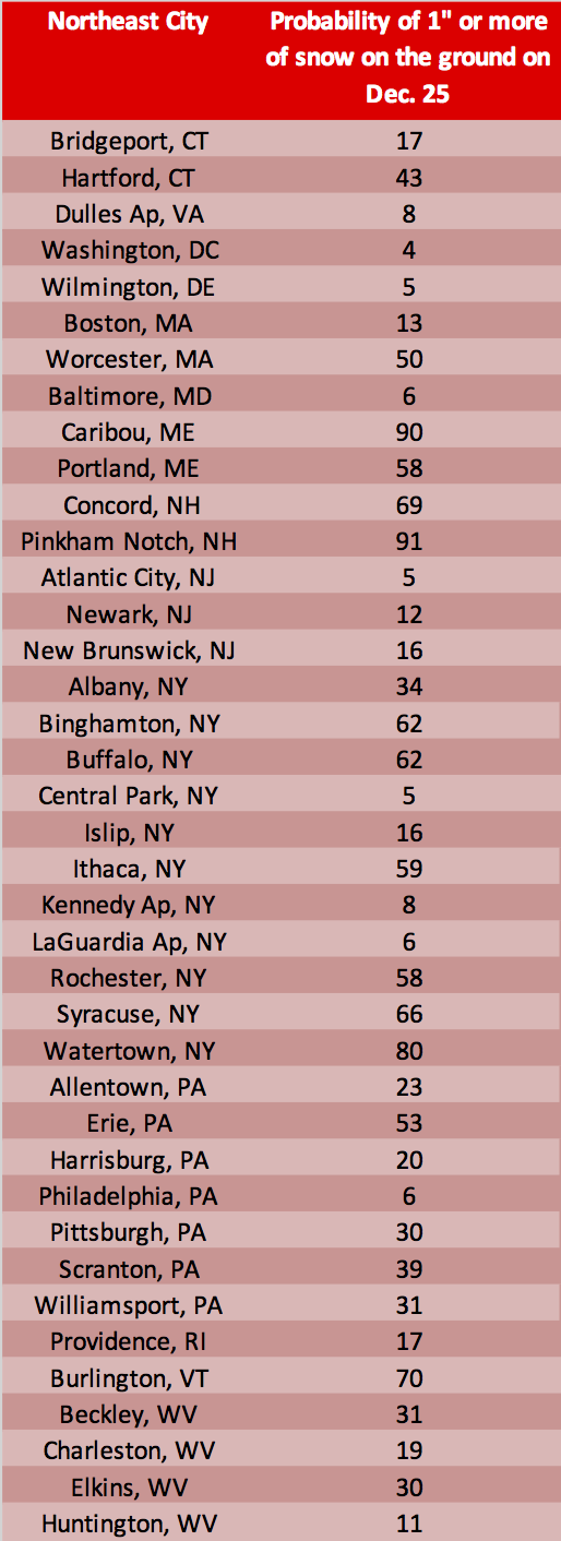 We’ve calculated the probabilities for an inch of snow on the ground on December 25th, based on data from 1968-2017, for select U.S. and Northeast cites. Fairbanks, AK always tops our list, as they’ve had a white Christmas for the last 50 years! Pinkham Notch, NH comes in second with a 91% probability. You only need an inch of snow on the ground for a white Christmas, but how much has there been in the past?