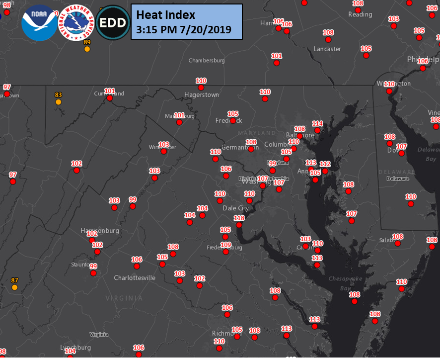 July is the hottest month in the Northeast, with normal maximum (max) temperatures ranging from the mid-70s to the upper 80s and normal minimum (min) temperatures ranging from the mid-50s to the low 70s. The past few days, much of the Northeast dealt with a heatwave, with the highest temperatures reaching 100°F. The combination of heat and unusually high humidity prompted Excessive Heat Warnings for much of the region and made it feel as hot as 114°F in some places. While quite hot, only a few major climate sites set daily max temperature records and the heat wasn’t enough to challenge any all-time warmest July max temperatures.