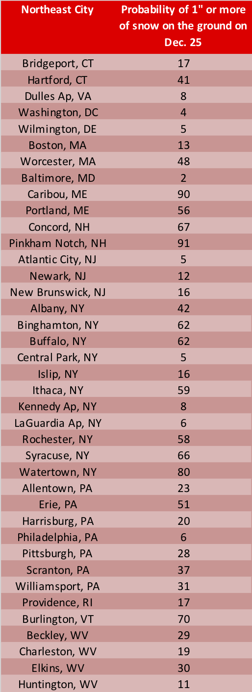 Snow for Christmas present is a bit uncertain for the Northeast, as some of the early December snowfall has since melted. The outlooks favor above-normal temperatures for much of the country, which could lead to additional melting before the holiday. But, there is still time for a Christmas miracle. Check your local National Weather Service office for an up-to-date forecast.