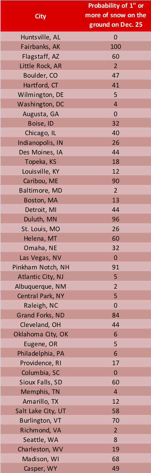 We look at Christmases past to determine the probability of having a white Christmas. Fairbanks, AK has had snow on the ground every Christmas from 1969 through 2018! Looking at those same 50 years, Pinkham Notch has a 91% probability of a white Christmas. See probabilities for other select U.S. and Northeast cities.