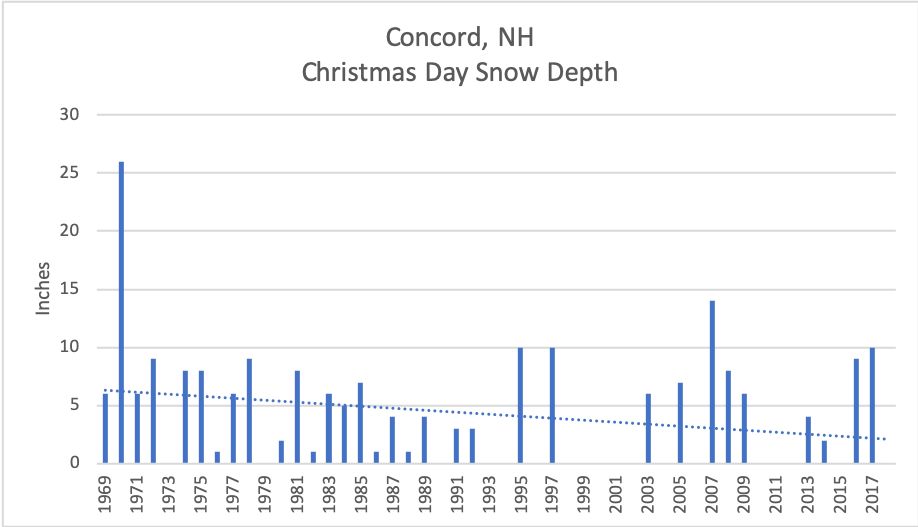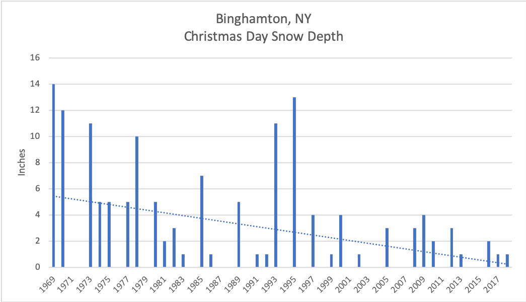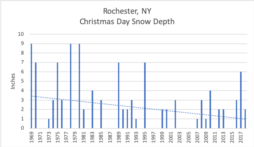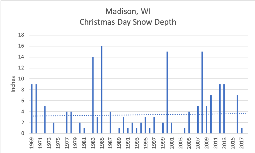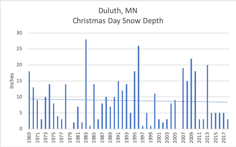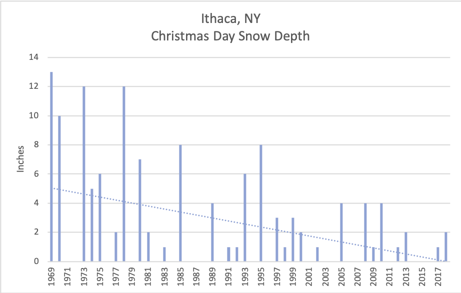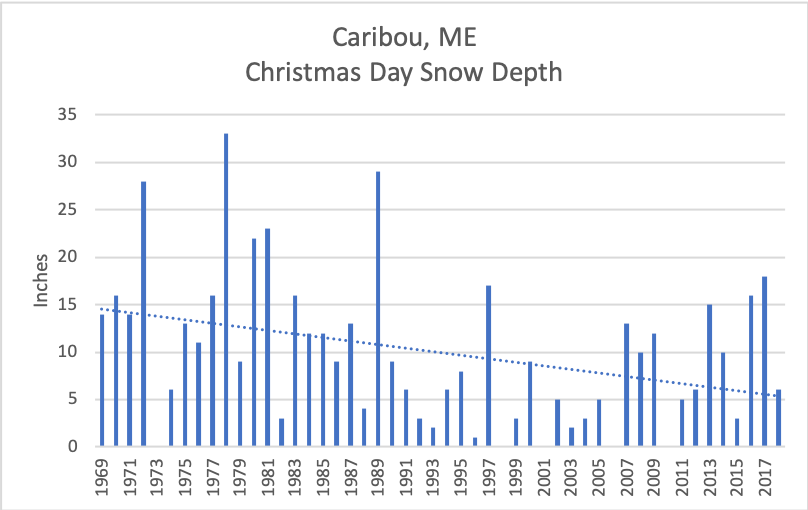This time series shows Christmas Day snow depth decreasing over the last 50 years.