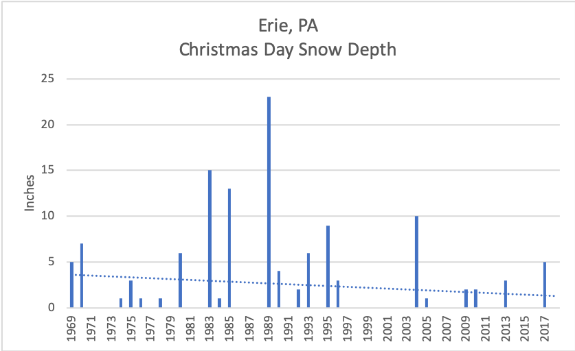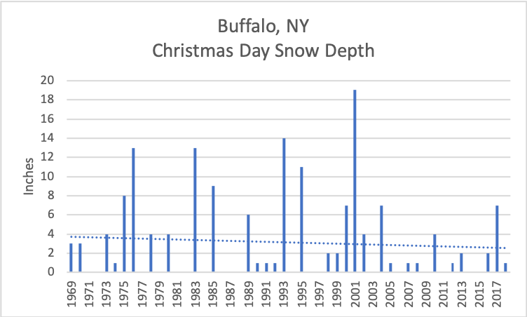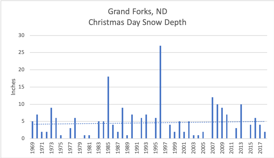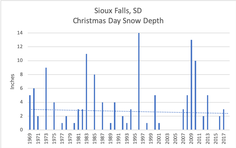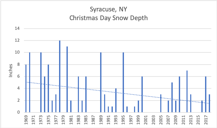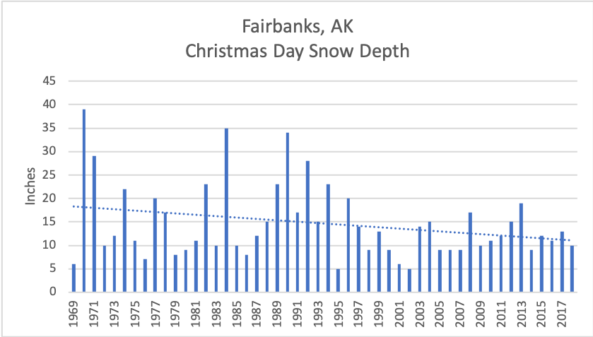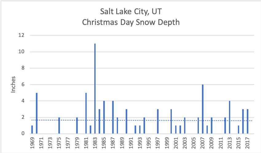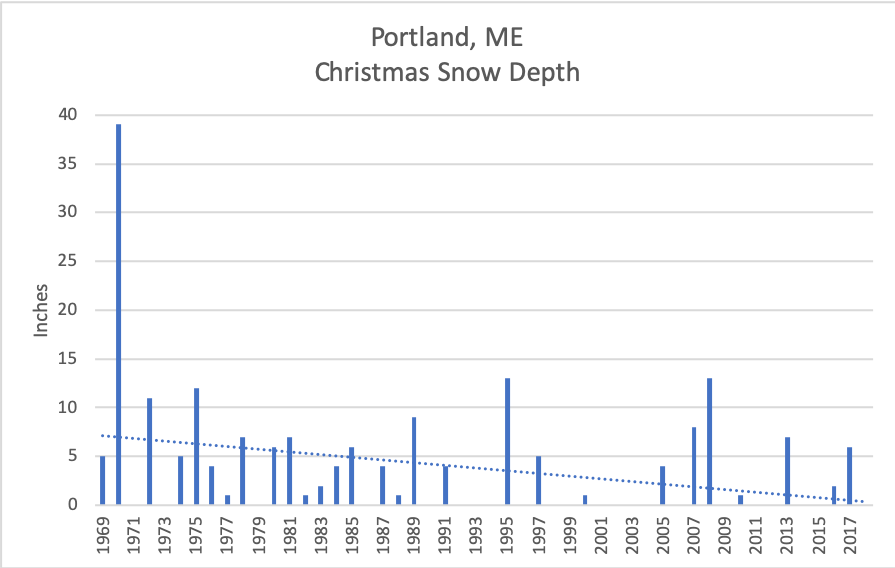 This time series shows Christmas Day snow depth decreasing over the last 50 years.