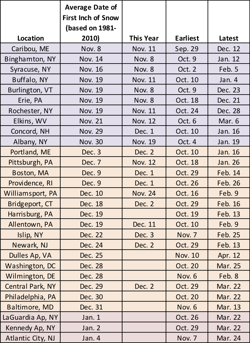 In addition, nine major climate sites are still waiting for their first inch of snow. While the average date for the New York City airports and Atlantic City, NJ, is early January, Harrisburg, PA, is two weeks overdue for theirs.