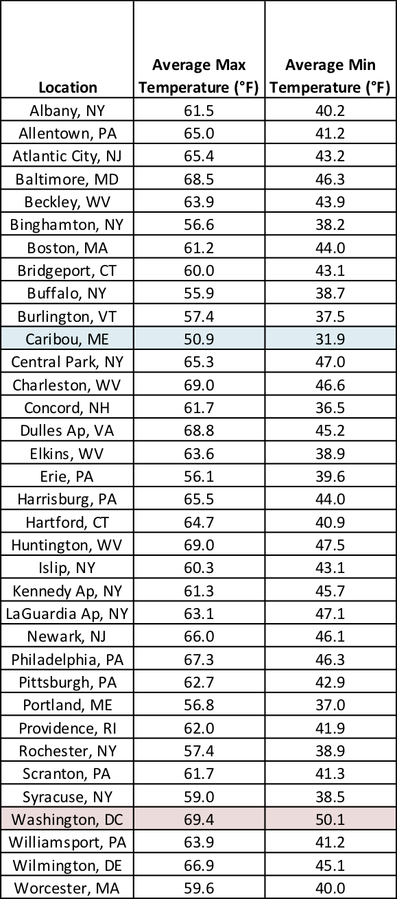 The average high temperature on Earth Day ranges from 50.9°F in Caribou, ME, to 69.4°F in Washington, D.C. The hottest Earth Day celebration occurred in Wilmington, DE, in 1985 when the mercury soared to 94°F. Average low temperatures range from 31.9°F in Caribou, ME, to 50.1°F in Washington, D.C., The Earth Day celebration in 1981 was a bit frosty in Caribou, ME, when the low dropped to 19°F.