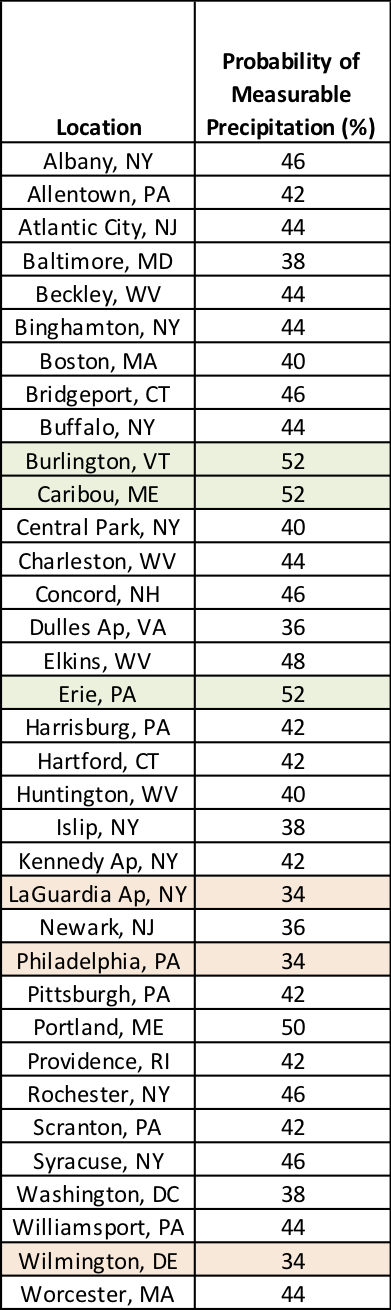 What’s the likelihood of precipitation on Earth Day? It ranges from 34% in Wilmington, DE; Philadelphia, PA; and LaGuardia Airport, NY, to 52% in Burlington, VT; Caribou, ME; and Erie, PA. The soggiest celebration occurred at Dulles Airport, VA, in 2006 when the site saw 2.88 inches of precipitation.
