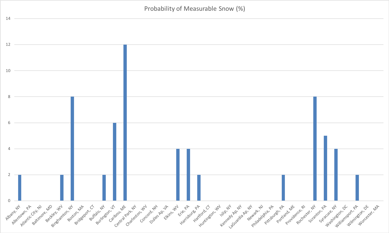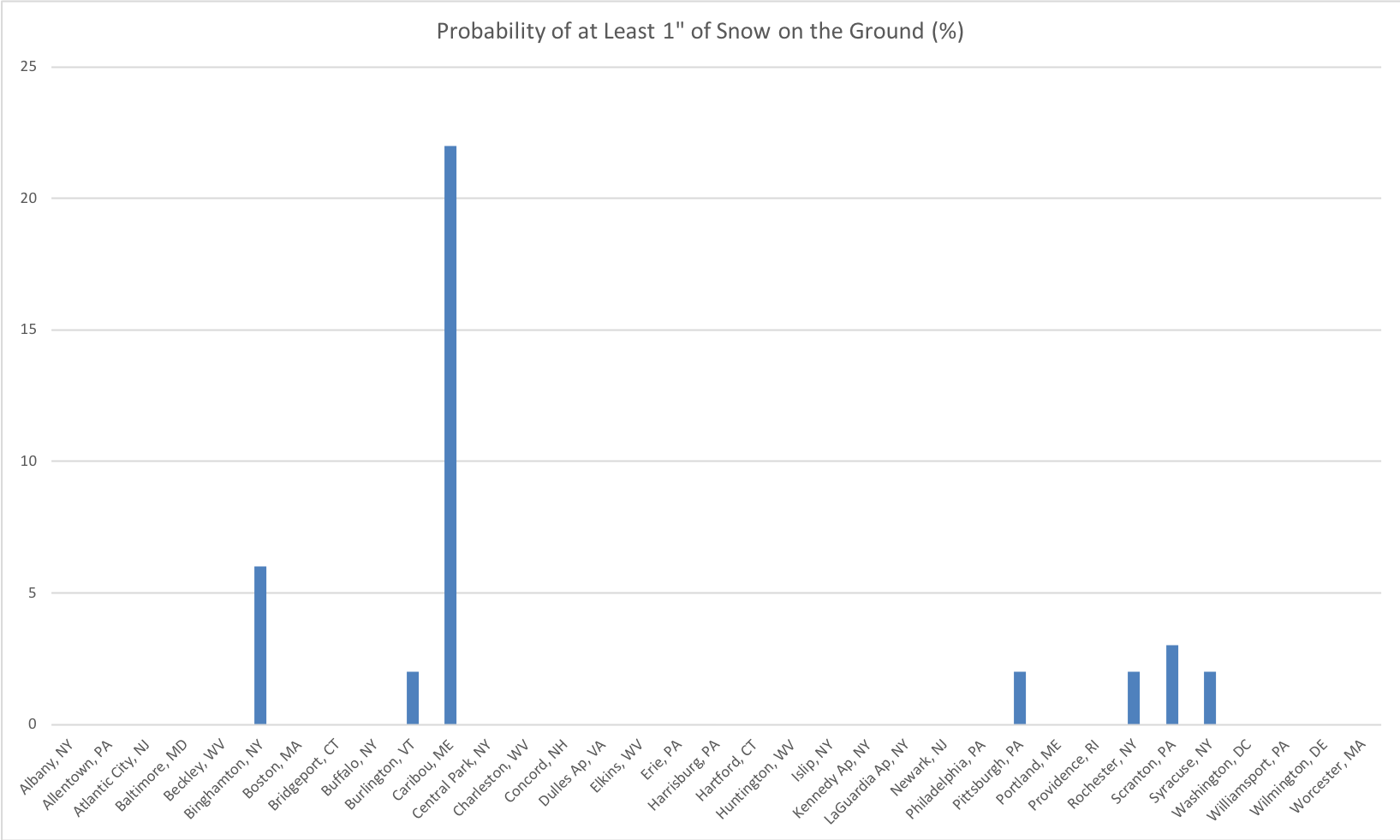 As we approach the end of April, snow becomes less likely, even in some colder locations. For instance, Caribou, ME, historically only has a 12% chance of seeing measurable snow on Earth Day. Interestingly, the site is not where the snowiest celebration occurred. That was in Binghamton, NY, which picked up 8.6 inches of snow in 1993. Of note - Hartford, CT, is the only major climate site to not report snow, not even a trace, on Earth Day (although, the site is missing a few years of data). Caribou is the most likely site to have at least an inch of snow depth on April 22 with a 22% chance. It also tied Binghamton with the greatest Earth Day snow depth of 5 inches, in 1982 for Caribou and in 1983 for Binghamton.