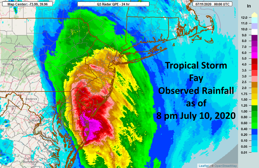 There were only two days during the first half of July without flash flooding or some type of severe weather in the Northeast. Thunderstorms dumped localized heavy rain in some areas. For instance, Bridgeport, CT, had its second wettest July day on record on the 3rd with 3.99 inches of rain. One particularly notable event was severe flash flooding in the northern suburbs of Philadelphia, PA, on July 6. Between 4 and 6 inches of rain caused rapid rises on some waterways, closing numerous roads, submerging vehicles, and leading to dozens of water rescues. A rare flash flood emergency was issued by the Philadelphia/Mt. Holly National Weather Service office. In addition, Tropical Storm Fay made landfall in New Jersey on July 10 and dropped between 2 and 6 inches of rain on parts of Maryland, Delaware, eastern Pennsylvania, New Jersey, southeastern New York, and southwestern Connecticut. In fact, Philadelphia, PA, had its fourth wettest July day on record with 4.15 inches on July 10.