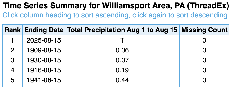 This August 1-15 period was record dry for Williamsport, PA, and ranked among the 20 driest for another 17 major sites.